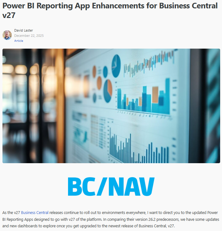 I recently completed a new educational post as part of the All-Star Experts series about new features and changes in the v27 Power BI App Reports for Business Central. These reports have evolved substantially, been refined, and are ready for you to deploy and begin using right away. While you are here, please also check out the other content I have on the Power BI apps for BC on the main https://www.thedynamicsmindset.com/ page. Check out the link below to read the full contents of the User Group article.