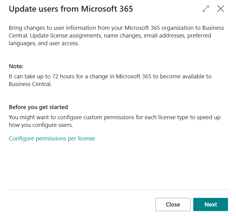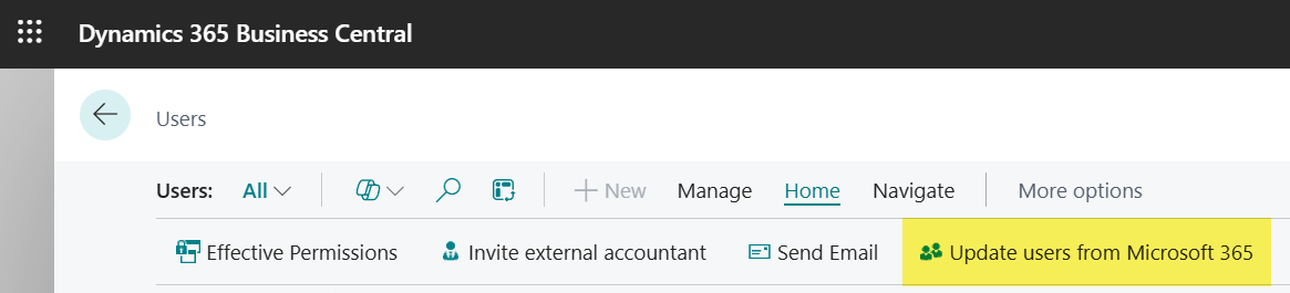 The process for pulling newly licensed users into the BC tenant is managed from the Users page by an administrator. When triggering the “Update users from Microsoft 365 event,” Business Central will look to Azure for new users or changes in user info or license assignments on existing users and then bring them over to the user list for setting up.