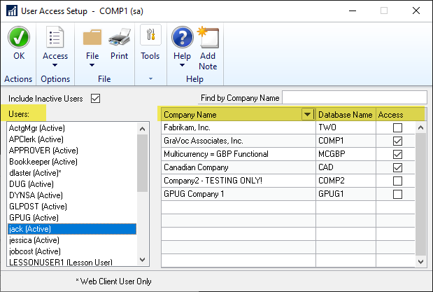 After the registration keys are applied and a new license opens up, your new GP users are configured with the appropriate Role(s) which contain Tasks that group operations together in a logical way. These security Roles enable permissions for assigned users within the application to enter windows, create or post records, or run reports. Users often have more than one role assigned to group different functional permissions together. Finally, users are granted permission to each company, for which security and permissions can be dialed in as needed and do not need to remain the same across all entities.