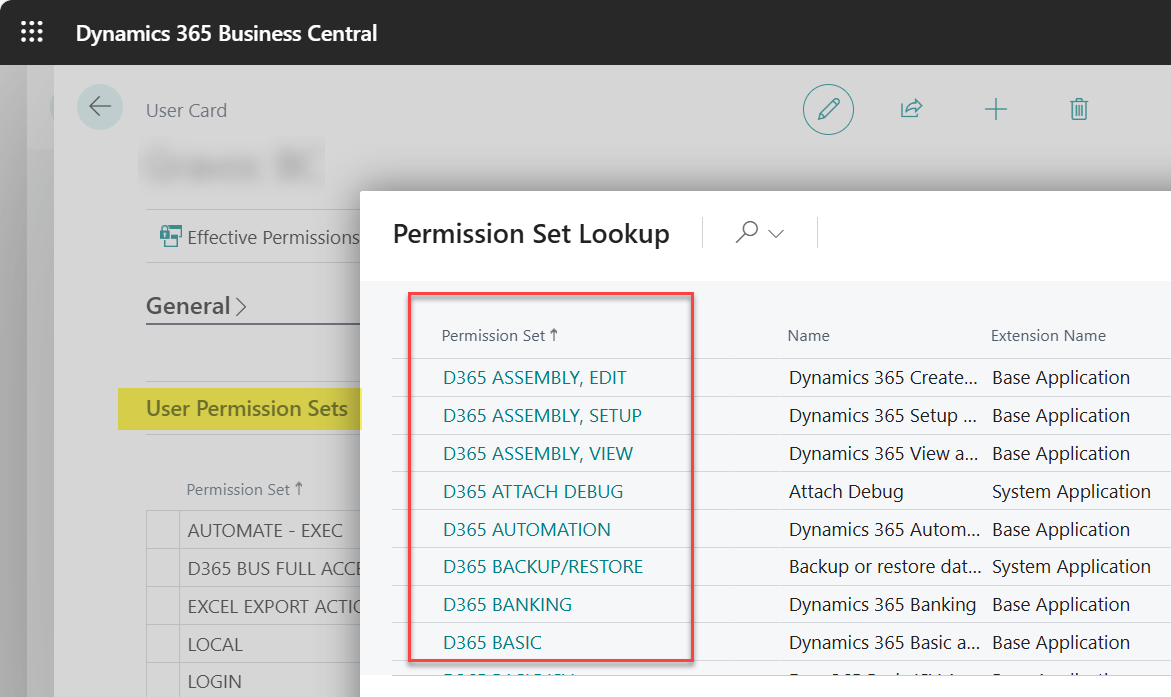 After the new user appears in BC it is time to work on their permissions. Assigning permissions in Business Central is done on the User card. Much like Dynamics GP, Business Central also has a role-based security model whereby combinations of Permissions Sets allow users to have access to modules or to perform different functions within the application. There are many pre-defined permission sets, but it is also fairly common to create your own. It is important to note that the out-of-the-box permission sets are subject to change, especially as new features are introduced to the application. I typically use telemetry and the Power BI usage reporting to see when these changes occur.