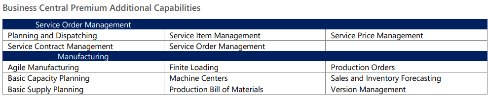 When choosing the top-tier Premium license for BC, you can see it includes all of the Essentials modules plus all of the elements you need to take advantage of the Service and Manufacturing capabilities in BC:
